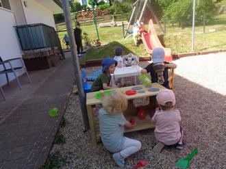 Mit großer Freude spielen die Krippenkinder in der Matschküche. Wir bedanken uns für die Spende vom Förderverein.
