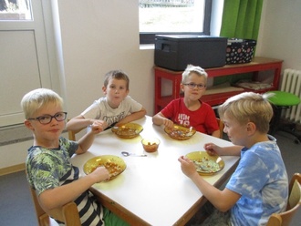 Buchstabensuppe mit Kohlrabi , Zwiebeln ,Knoblauch und Liebstöckel. Die Kinder schälten und schnitten alles in kleine Würfel . Maggikraut wurde gewaschen und klein gezupft. Wasser zum Kochen gebracht, alles hinein getan Buchstabennudeln hinzugefügt . Alle Vorschulkinder waren sich einig: „Diese Suppe schmeckt gut !“