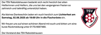Der TSV Raboldshausen bedankt sich recht herzlich bei allen Helferinnen und Helfern, die uns bei den vergangenen Festen so zahlreich und tatkräftig unterstützt haben.