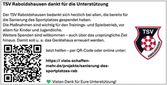 Der TSV Raboldshausen bedankt sich herzlich bei allen, die bereits für die Sanierung des Sportplatzes gespendet haben.