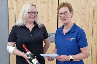 Tanja Grenzbach wird von Blutspende Helferin Irene Schaar-Nitz mit einem Präsent für die 75te Spende geehrt.