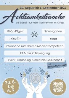Vom 30. August bis 6. September 2025 lädt unsere erste Achtsamkeitswoche dazu ein, bewusst innezuhalten und Neues zu entdecken. Freuen Sie sich auf spannende Vorträge, inspirierende Veranstaltungen und abwechslungsreiche Aktivitäten.