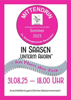 | 18.00 Uhr | Saasen, mittendrin-Gottesdienst am Ahorn |