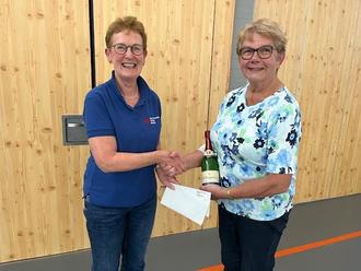 Gisela Bechtel (re) erhält von Blutspende Helferin Irene Schaar-Nitz (li) einen Gutschein und ein Präsent für die 100. Blutspende. Vielen Dank dafür.