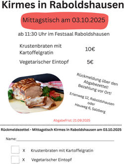 im Rahmen der diesjährigen Kirmes in Raboldshausen wird es im Anschluss an den Erntedankgottesdienst, der am 03.10.25 um 10:30 Uhr im Festsaal stattfindet, einen gemeinsamen Mittagstisch geben.