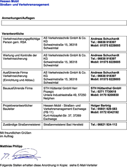 | Verkehrssicherungspflichtige Person gem. RSA | AS Verkehrstechnik GmbH & Co. KG Schwalmstraße 15, 36318 Schwalmtal |
