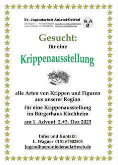 Am 1. Adventswochenende wird eine sehenswerte Ausstellung stattfinden, dieses Mal im Bürgerhaus Kirchheim.Über 80 Krippen aus der Bevölkerung der Region konnten bei den vorigen Ausstellungen gezeigt werden und ein kleines Cafe wurde mit weihnachtlichen Leckereien angeboten. So schön soll es auch an diesem 1. Advent werden! Ab sofort können alle Arten von Krippenfiguren und Darstellungen bei mir als Leihgabe angegeben werden. Fragen klären und Infos gibt es bei mir Lydia Wagner 0151 67802505.