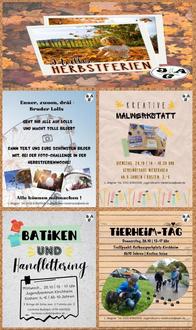 Diesmal sind die Herbstferien direkt im Anschluss an die Lollswoche und nur eine Woche lang. Das ist nicht mehr lange hin, darum gibt es jetzt schon den Flyer mit den Aktionen zum Vorplanen! Anmeldungen bei L. Wagner nach ihrer Urlaubswoche ab Montag, 9.Okt.