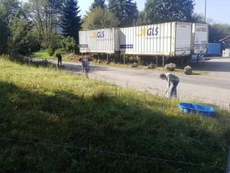 Begonnen wurde, wie immer, am DGH, Kirche und Ex-Feuerwehrhaus mit dem Entfernen von Unkraut, Zweigen, Ästen, Laub und eben auch Dreck, welcher in der Schaufel von Helmut Schades Radlader sein Ende fand. Weiter ging es über die Geisbrücke in die Ahornstraße bis hoch zum Wiegehäuschen und dem Friedhofsparkplatz. Im Zuge der Reinigungs- und Pflegearbeiten wurden auch die Gullis der Ahornstrasse von Schmutz und Dreck befreit, so dass nunmehr ein ordentlicher Wasserablauf gewährleistet ist. Trotz des mehr als warmen Wetters wurde konstruktiv durchgearbeitet um sich dann bei Gisela Hildebrand mit Essen und Trinken inklusive Kaffee und Kuchen bewirten zu lassen.