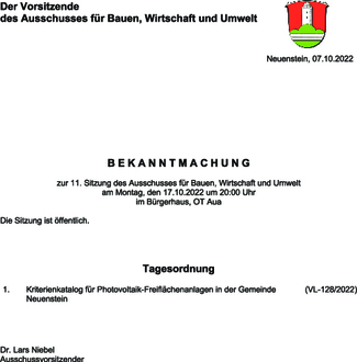 | 1. | Kriterienkatalog für Photovoltaik-Freiflächenanlagen in der Gemeinde Neuenstein | (VL-128/2022) |