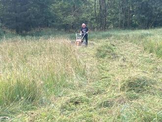 Ein Helfer vom SCN bereitet mit dem Doppelbalkenmäher das Abräumen der Gras- und Krautschicht vor. Alljährlich muss der Bewuchs der Orchideenstandorte am Eisenberg entfernt werden. Würde der Bewuchs stehen bleiben, im Winter umsinkend den Boden bedecken, entstünde durch die Verrottung ein Nährstoffeintrag, der für die heimischen Orchideen ungünstig ist. Sie brauchen feuchte nährstoffarme Böden.