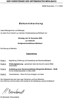 wir laden Euch herzlich zur nächsten Ortsbeiratssitzung Mühlbach ein: