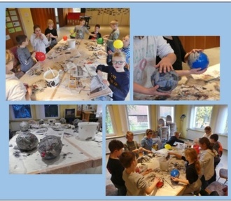 Mit viiiielen Zeitungsschnipseln haben wir Luftballons für Kleisterfiguren beklebt und sind gespannt, was für Gestalten dabei herauskommen! Hoffentlich ist alles dann getrocknet, sonst müssen wir die weitere Verarbeitung aufschieben.