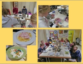 Mmmmh, Nudeln mit Schinken-Sahnesoße waren nicht schwer zu kochen nach dem einfachen Rezept und haben richtig gut geschmeckt! Dazu noch Ananasscheiben mit Sahne und süßen Perlen als Nachtisch – lecker! Alle sind schon gespannt, was wir die nächsten Male kochen und bringen alle Küchenutensilien im großen Beutel mit. Diese Woche gibt es Pfannkuchen und Obstsalat als Nachspeise.