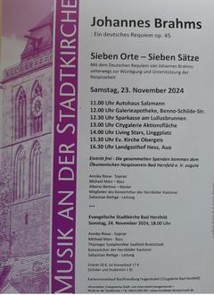 An diesem Tag wird das Deutsche Requiem von Johannes Brahms aus dem traditionellen Konzertrahmen herausgenommen und dem leicht zugänglichen Erleben der Musik an ungewöhnlichen Orten eine aktuelle gesellschaftspolitische Dimension gegeben. Unter dem Motto: