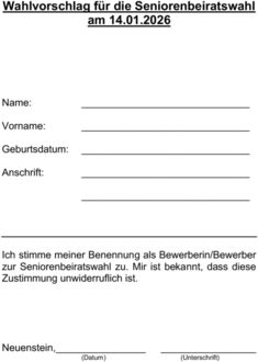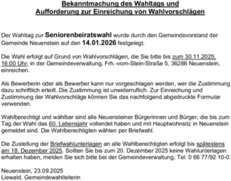 Der Wahltag zur Seniorenbeiratswahl wurde durch den Gemeindevorstand der Gemeinde Neuenstein auf den 14.01.2026 festgelegt.