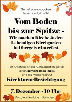 Wir laden herzlich ein zu einer großen Putz- und Aufräumaktion! Gemeinsam wollen wir die Kirche auf Hochglanz bringen und den Lebendigen Kirchgarten für die bevorstehenden Adventsmomente vorbereiten.