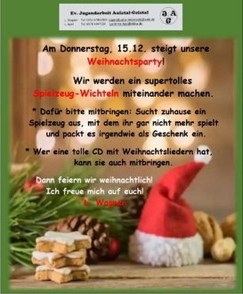 Heute startet unsere Weihnachtsparty! Dabei wollen wir Spielzeug-Wichteln machen: Sucht zuhause nach einem ausrangierten Spielzeug, packt es in irgendwelches Papier wie ein Geschenk ein und bringt es zur Party mit für ein lustiges Wichtel-Spiel.