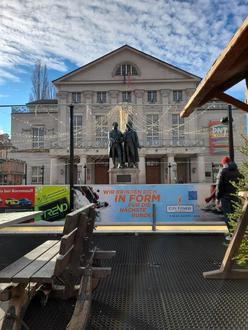 Eine Eisbahn präsentiert sich vor der Kulisse des Deutschen Nationaltheaters und die Eisfläche umrahmt das Goethe- und Schiller-Denkmal.