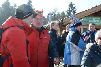 Am vergangenen Donnerstag war es endlich soweit und der SC Neuenstein konnte die geplante Fahrt zur Biathlon-Weltmeisterschaft nach Oberhof antreten. Organisator und 2. Vorsitzender Stefan Langbein, selbst ehemaliger Leistungssportler Langlauf auf dem Sportinternat in Oberhof zu Jugendzeiten, konnte über 40 Mitglieder und Biathlon-Fans im Reisebus begrüßen, die bestens verpflegt und unterhalten wurden. Bei Sonnenschein und optimalen Rahmenbedingungen erreichte man die WM-Arena in Oberhof und begab sich fußläufig zur Thüringer Hütte, wo Willi Fischer, Vater des vielfachen Olympiasiegers und Weltmeisters sowie ZDF-Experten Sven Fischer, die Gruppe begrüßte. In einem munteren und sehr informativen Talk mit SCN-Pressesprecher Reiner Birkel gab der Biathlon- und Sportexperte aus Schmalkalden viele Einblicke hinter die Kulissen dieser beliebten und populären Sportart und Stand anschließend auch für Fragen zur Verfügung. Begrüßen konnte Stefan Langbein dann auch noch HZ-Sportredakteur Hartmut Wenzel, der sich zur Runde gesellte. Im Anschluss hatte die Gruppe noch Zeit, um sich vor Ort mit einer Thüringer Bratwurst und Warm- bzw. Kaltgetränken auf die an diesem Tag stattfindende Mixed-Staffel einzustimmen. Wie an den Wettkampftagen zuvor, war das Stadion auch diesmal in "norwegischer Hand", denn die zahlreichen Fans aus dem Norden Europas konnten erneut einen Sieg und somit die Goldmedaille durch ihr Team bejubeln.