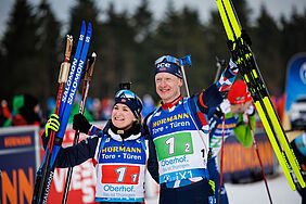 Denn die Siegesserie von Johannes Thingnes Boe ging weiter. Zusammen mit der Bronzemedaillengewinnerin in der Verfolgung, Marte Olsbu Roeiseland, konnte der 29-Jährige nach insgesamt acht Schießeinheiten, Österreich (+9.8 Sekunden) und Italien (+41.8) auf die weiteren Medaillenränge verweisen und sich sein fünftes Gold (!) im fünften Rennen sichern.