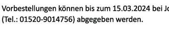 Vorbestellungen können bis zum 15.03.2024 bei Johanna Diebel (Tel.: 0172-2494531) & Sara Nitsche (Tel.: 01520-9014756) abgegeben werden.