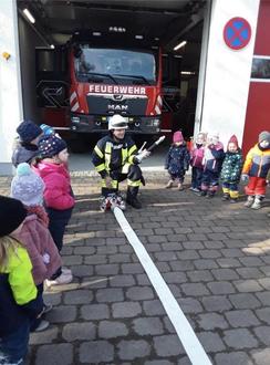 Vom 17.02.25 - 21.02.25 haben die Kinder der Kita Sonnenschein im Rahmen eines Projektes unter anderem die Feuerwehr in Raboldshausen besuchen können. Tim Schmidt führte die Kinder durch die Räumlichkeiten der Feuerwehr und erklärte den Kindern den Ablauf eines Feuerwehreinsatzes. Zum Abschluss konnten die Kinder mit einer Kübelspritze einen Baum mit Wasser bespritzen.