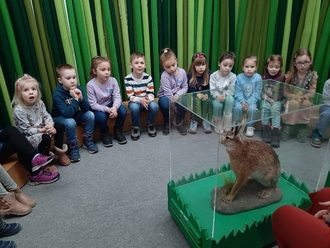 Die Kinder lernten während der Führung durch die Ausstellung wie ein Feldhase aussieht, wo er lebt, was er frisst, was er besonders gut kann und vieles mehr. Manches durften die Kinder dabei selbst ausprobieren, z.B. wie weit ein Hase hüpfen kann.