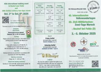 Immer am 1. Oktober-Wochenende kommen bis zu 1000 Wanderer und Marschierer aus aller Welt zum Wandern in die Region Fulda. Die meisten erwandern an mind. 2 Tagen verschiedene Strecken. Die Teilnehmer können wählen, welche Strecke sie erwandern möchten. Angeboten wird samstags 6, 11, 21, 30 und 42 km und sonntags 6, 11, 21 und 30 KM. Damit einem die Kräfte nicht schwinden, werden verschiedene Kontroll- und