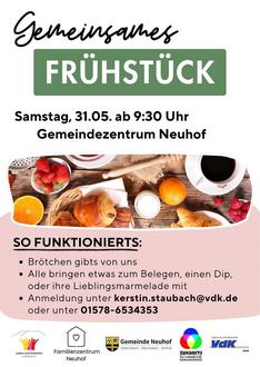 Am Samstag, den 31. Mai 2025, lädt das Gemeindezentrum Neuhof ab 9:30 Uhr zu einem offenen Frühstück für alle ein. Unter dem Motto „Teilen macht Freude“ bringt jeder etwas mit – ob Lieblingsmarmelade, ein Dip oder Aufschnitt. Brötchen stellt das Organisationsteam. Die Aktion wird vom Familienzentrum, dem Verein „Leben und Arbeiten in Neuhof e. V.“ und weiteren Partnern unterstützt. Anmeldung unter: kerstin.staubach@vdk.de oder 01578-6534353.