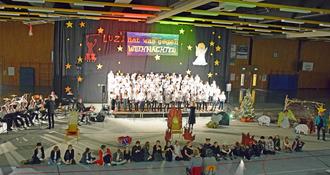 Schulleiterin Karin Schneider bedankte sich zum Schluss bei allen Akteuren und den zahlreichen Zuschauern auf den voll besetzten Rängen. Sodann sang die ganze Schulgemeinschaft „Oh du Fröhliche“ und ließ die Grundfesten der Kreissporthalle weihnachtlich erbeben. Ein gelungener Musical-Abend in Neuhof ging fröhlich zu Ende.