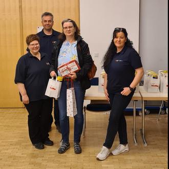 125. Blutspenderin Sonja Heß (Mitte), Ulrike Lipus, Andreas und Ute Wolf, Helfer des Blutspendeteams OV Neuhof