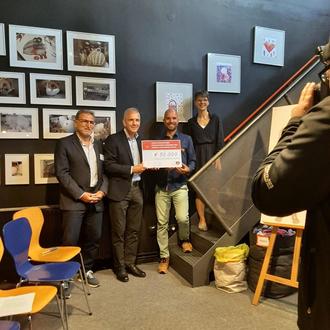 überreichen Ingmar Süß und Angela Zentgraf (beide Kinder-Akademie) den Zuwendungsbescheid über 50. 000 Euro.