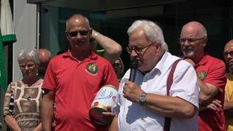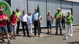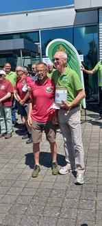Nach der Mittagspause fand gegen 13.30 Uhr die Wimpelübergabe statt. Die Wandergruppe aus Bischofsheim war am Samstag mit dem traditionellen Rhönklubwimpel die Wanderstrecke von 41 Kilometern nach Neuhof gelaufen und hat auch, nach einem gemeinsamen Abendessen mit den Vorständen des Zweigvereins Neuhof, in Neuhof übernachtet. Mit musikalischer Umrahmung durch die Kirmesmusikanten aus Hattenhof zog die Wimpelgruppe mit dem Neuhofer Rhönklubvorstand vom historischen Neuhofer Dallesplatz über den Zollweg zum Gemeindezentrum, wo sie zur Wimpelübergabe von Rhönklubpräsident Jürgen Reinhardt und dem Neuhofer Bürgermeister Heiko Stolz empfangen wurden. Die Moderation der Wimpelübergabe übernahm Norbert Möller, der Vorsitzende des Zweigvereins Neuhof. Nach jeweils kurzen Ansprachen wurde der Wimpel vom Bischofsheimer Vorsitzenden Dieter Büttner an den Rhönklubpräsidenten Jürgen Reinhardt übergeben, welcher ihn mit einem entsprechenden Grußwort an Bürgermeister Heiko Stolz zur Aufbewahrung bis zur Gesamt-Rhönklub Hauptversammlung im nächsten Jahr übergab.