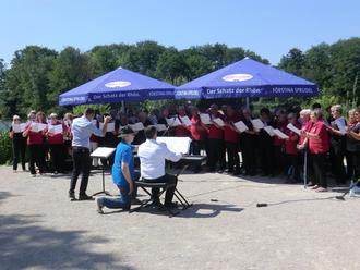 Auch die Chorvereinigung Cäcilia Neuhof und die Concordia Mittelkalbach beteiligten sich an diesem Event. Vormittags um 11.30 Uhr stellten wir uns auf dem Platz des Bleichhäuschens am Aueweiher auf. Jeder versuchte, unter einem Sonnenschirm einen Platz zu findend denn war warm an diesem Tag. Das tat aber unserer Lust zu Singen keinen Abbruch. Zumal die Stühle auf dem Platz alle besetzt waren und auch noch viel Publikum im Schatten stand um uns zuzuhören.