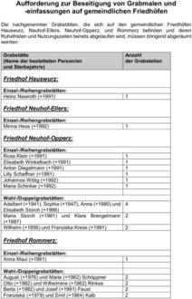 Die Nutzungsberechtigten der vorgenannten Grabstätten sind gemäß § 36 Abs. 2 der Friedhofsordnung der Gemeinde Neuhof in der derzeit gültigen Fassung verpflichtet, die Grabmale, die Einfassungen und sonstigen Grabausstattungen einschließlich der Fundamente der vorgenannten Grabstätten zu entfernen und ordnungsgemäß zu entsorgen.