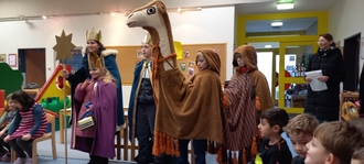 Drei Könige, ein Sternträger und ein Kamel wurden freudig von den Kindern und den Erzieherinnen im großen Atrium des Kindergartens begrüßt. Pfarrer Merz und zwei Mütter begleiteten die Gruppe und erzählten den Kindergartenkindern die biblische Geschichte von den Hl. Drei Königen und erklärte die Bedeutung und Aufgabe der Sternsinger.