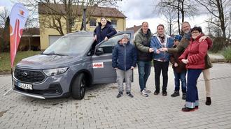 Andree Literski und Petra Kress vom Vorstand "Leben und Arbeiten in Neuhof" überreichen symbolisch den Schlüssel des Fahrzeugs an das glückliche Team des Pfarrhauses rund um den Inklusionsnetzwerker Benedikt Bein, der zusammen mit antonius : gemeinsam Mensch die Inklusionsaktivitäten vor Ort koordiniert. Die finanzielle Unterstützung von Aktion Mensch spielt eine entscheidende Rolle bei der Umsetzung solcher Projekte, die das Ziel haben, Menschen mit Behinderungen eine uneingeschränkte Teilhabe am gesellschaftlichen Leben zu ermöglichen.