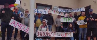 Trotz anhaltendem Dauerregens feierten die Fans vor dem Bürgerhaus in Neuhof-Rommerz ihren 3-fach Weltmeister Tim Happ sowie Amelie Achterling, die sich im Paarkampf mit ihrer Partnerin Joelle Ehling die Bronze-Medaille gesichert hat.