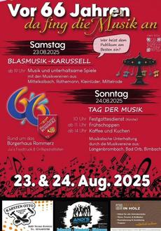 Am 23.08. und 24.08.2025 feiert das Blasorchester Rommerz 66. Jähriges Jubiläum am Bürgerhaus in Rommerz unter dem Motto „vor 66 Jahren da fing die Musik an“.