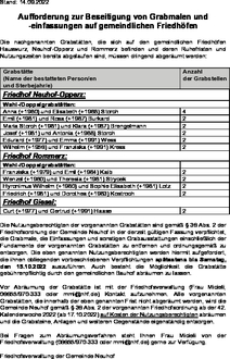 Die Nutzungsberechtigten der vorgenannten Grabstätten sind gemäß § 36 Abs. 2 der Friedhofsordnung der Gemeinde Neuhof in der derzeit gültigen Fassung verpflichtet, die Grabmale, die Einfassungen und sonstigen Grabausstattungen einschließlich der Fundamente der vorgenannten Grabstätten zu entfernen und ordnungsgemäß zu entsorgen. Die eben genannten Nutzungsberechtigten werden hiermit aufgefordert, die ihnen obliegenden vorbeschriebenen Verpflichtungen spätestens bis Samstag, den 15.10.2022 auszuführen. Auch besteht die Möglichkeit die Grabstätte gebührenpflichtig durch den gemeindlichen Bauhof abräumen zu lassen.
