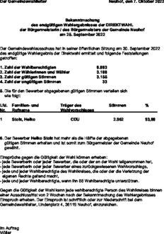 Bekanntmachung des endgültigen Wahlergebnisses der DIREKTWAHL der Bürgermeisterin / des Bürgermeisters der Gemeinde Neuhof am 25. September 2022