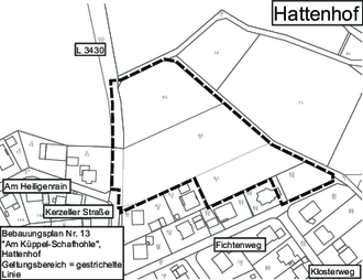 Der Geltungsbereich hat eine Größe von ca. 1,00 ha und umfasst die Grundstücke in der Gemarkung Hattenhof, Flur 3, Flurstücke 62/14, 63/1, 64/1, 65 sowie Flur 2, Flurstücke 103/12 und 103/13 (beide jeweils teilweise, „Kerzeller Straße“, L3430“) und ist der anliegenden Abbildung zu entnehmen.