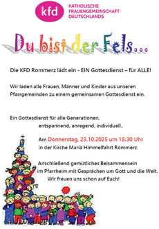 Auch in diesem Jahr laden wir wieder herzlich zu unserem „besonderen Gottesdienst für alle Generationen“ der kfd Rommerz am Donnerstag, 23.10.2025 um 18.30 Uhr in die Kirche nach Rommerz ein. Ein Gottesdienst der besonderen Art - in diesem Jahr unter dem Motto: „Du bist der Fels…“!
