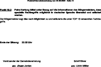 | Punkt 19.3 | Petra Hartung bittet unter Bezug auf die Informationen des Bürgermeisters, dass spezielle Fachbegriffe möglichst in deutscher Sprache übersetzt und erläutert werden. |