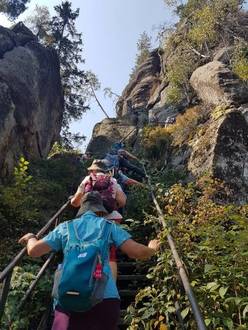 Die diesjährige Wanderwoche des Rhönklub Zweigvereins Neuhof führte die Wanderer in den Nationalpark Sächsische Schweiz, dem sächsischen Teil des Elbsandsteingebirges. Geplant war, auf vielen Teilstücken des durch Caspar Friedrich bekanntgewordenen Malerweges die bizarre Felsenwelt des Nationalparks zu erkunden. Auf dem Programm standen Wanderungen rund um den malerischen Erholungsort Bad Schandau als auch zu den spektakulären und weithin bekannten touristischen Zielen der Sächsischen Schweiz. Von einer gemütlichen Pension im Kirnitzschtal mit guter Anbindung an den öffentlichen Nahverkehr wurden bei bestem Hochsommerwetter die Tageswanderungen in die beeindruckende Felsenlandschaft gestartet. Zum Eingewöhnen wurde eine Kahnfahrt auf der Kirnitzsch unternommen, entlang steil aufragender Uferfelsen, gefolgt von dem Aufstieg durch enge Felsspalten zum Hermannseck. Herausfordernd waren die Wanderungen auf den Basteifelsen mit der Basteibrücke sowie zur Festung Königstein, die auf dem gleichnamigen Tafelberg liegt und eine der größten noch gut erhaltenen Festungen Europas ist. Beeindruckend waren die Ausblicke vom historischen Bad Schandauer Personenaufzug auf die Stadt und ins Elbtal und vom Ortsteil Ostrau auf die gewaltige Felsformation der Schrammsteine. Die Lichtenhainer Wasserfälle als auch die Wanderung zum „Kuhstall“, einem riesigen Felsentor auf dem Neuen Wildenstein, waren ebenfalls herausfordernde Wanderziele.