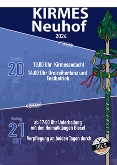 Die Kirmestanzgruppe Neuhof e.V. lädt am 20. und 21. Oktober 2024 herzlich dazu ein, die Neuhofer Kirmes am Opperzer Kirchplatz zu feiern.