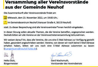 Versammlung aller Vereinsvorstände aus der Gemeinde Neuhof