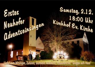 | 18.00 Uhr | Erstes Neuhofer Adventseinsingen auf dem Kirchplatz vor der evang. Kirche Neuhof, anschl. Glühwein-/Bratwurstverkauf, Waffeln und Kekse |