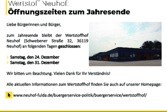 Wertstoffhof Neuhof: Öffnungszeiten zum Jahresende